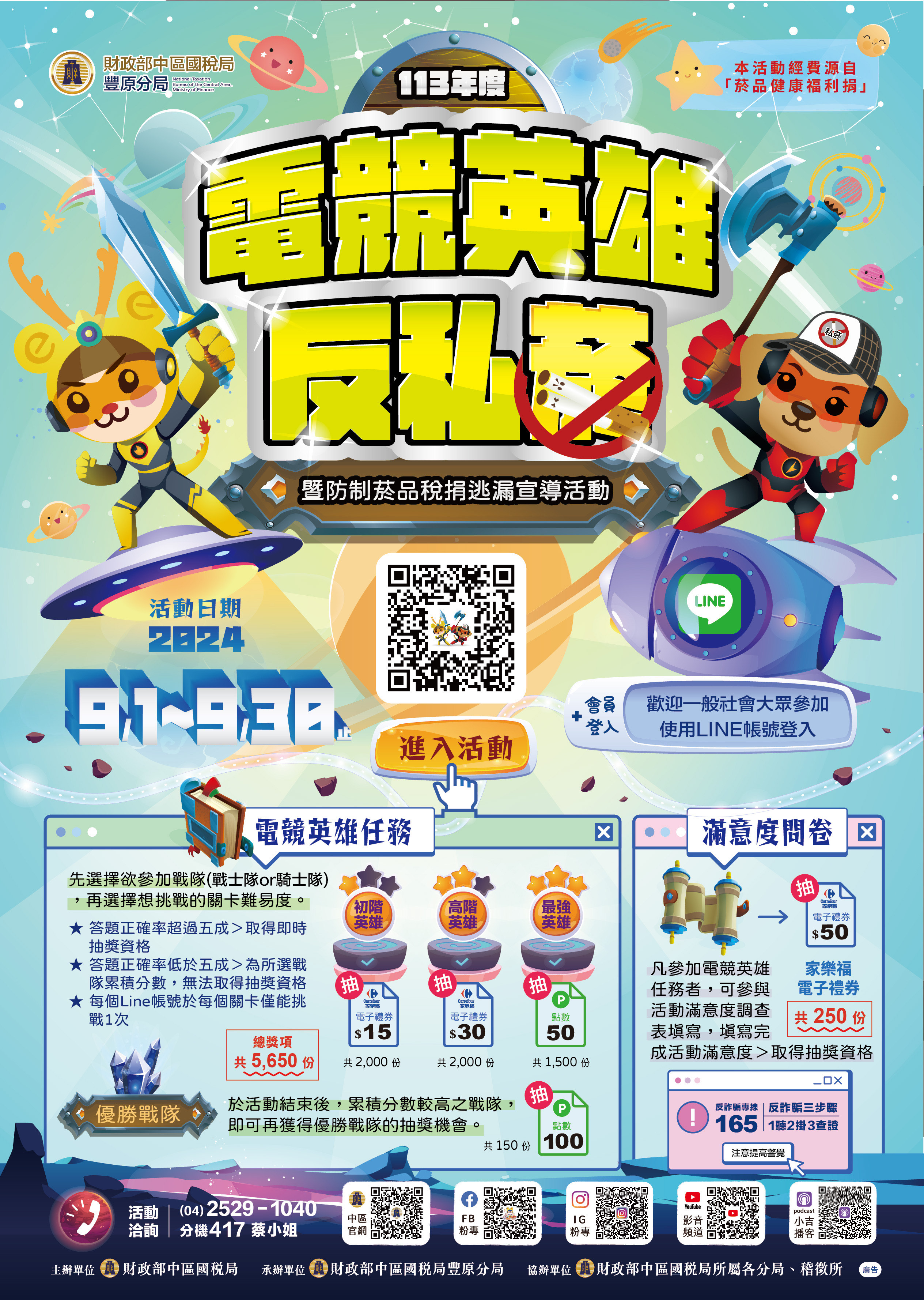 中區國稅局豐原分局為加強宣導菸品稅捐常識,建立民眾正確納稅觀念,辦理電競英雄 反私菸」暨防制菸品稅捐逃漏宣導活動。