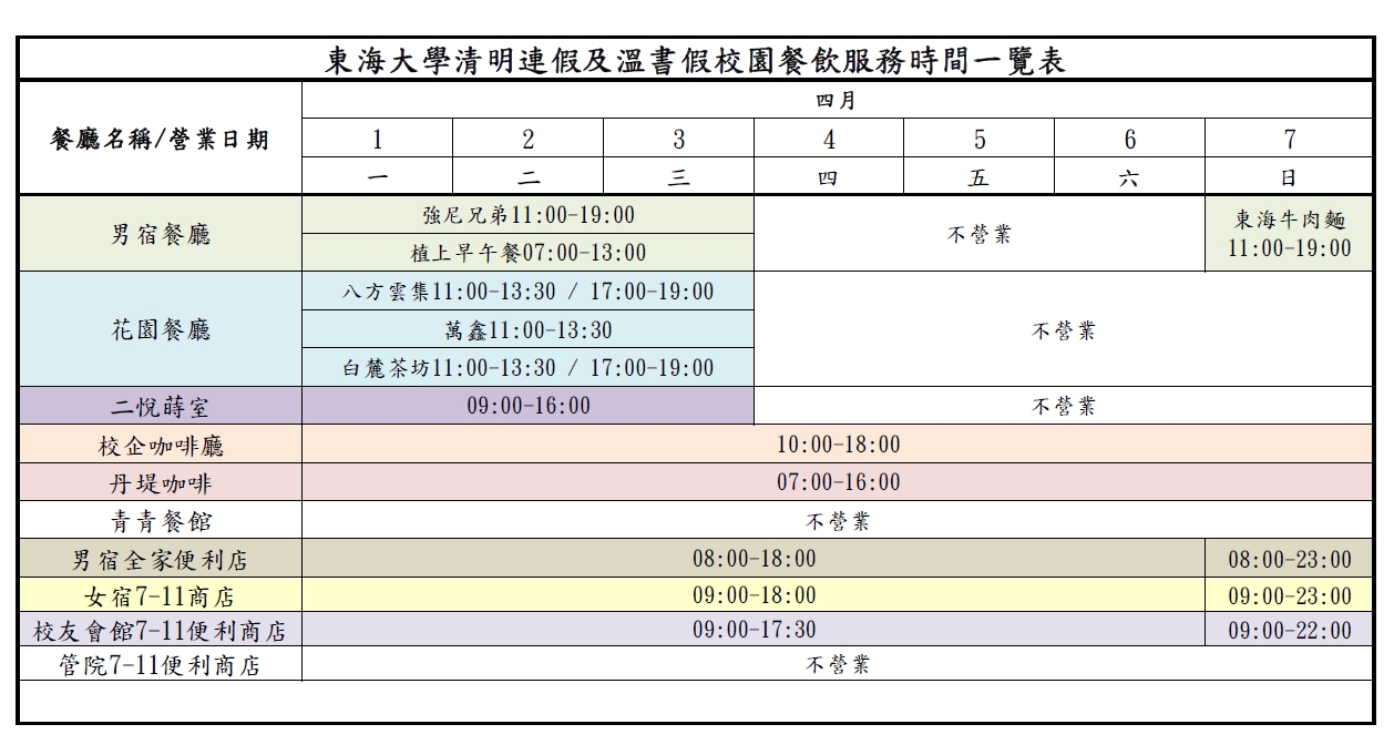 【公告】本校清明連假暨溫書假(4/1-4/7)餐廳營業時間