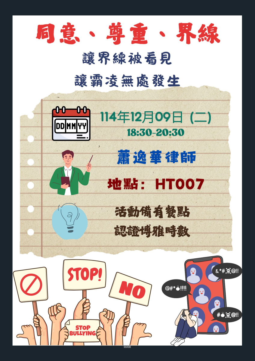 《同意、尊重、界線-讓界線被看見 讓霸凌無處發生》品德教育宣導推廣活動,歡迎同學踴躍報名參加