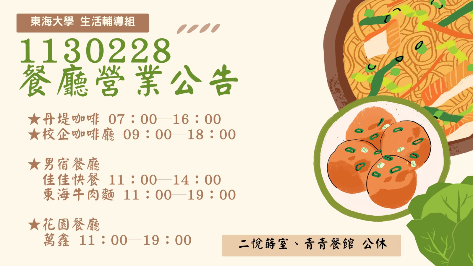 【公告】本校113年2月28日餐廳及便利商店營業時間